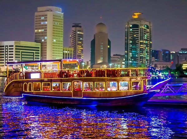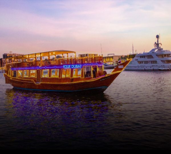 Cruising on Dubai’s historic Creek in a traditional wooden dhow, you’ll dine amidst scenes of unparalleled beauty. As the dhow sails along Dubai Creek, you’ll witness a transformation of the cityscape, with illuminated buildings from both old and new Dubai creating a performance that’s vastly different from the daytime scenery. Although this tour takes you through the Creek, for a different experience, you can also consider a dhow cruise in Dubai Marina, where the modern skyline and luxury yachts offer a stunning backdrop to your evening.